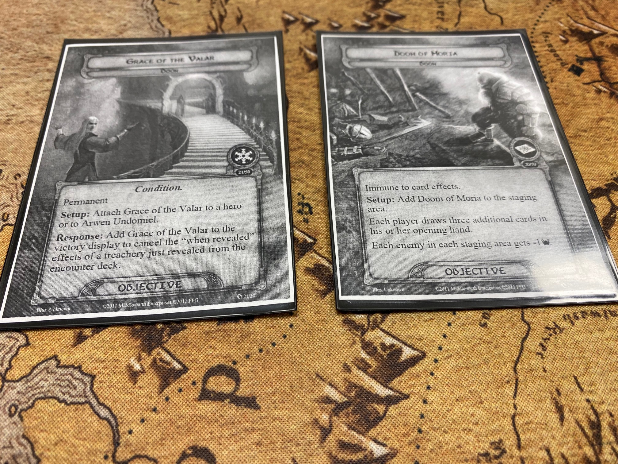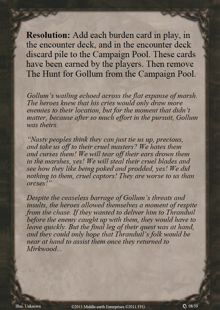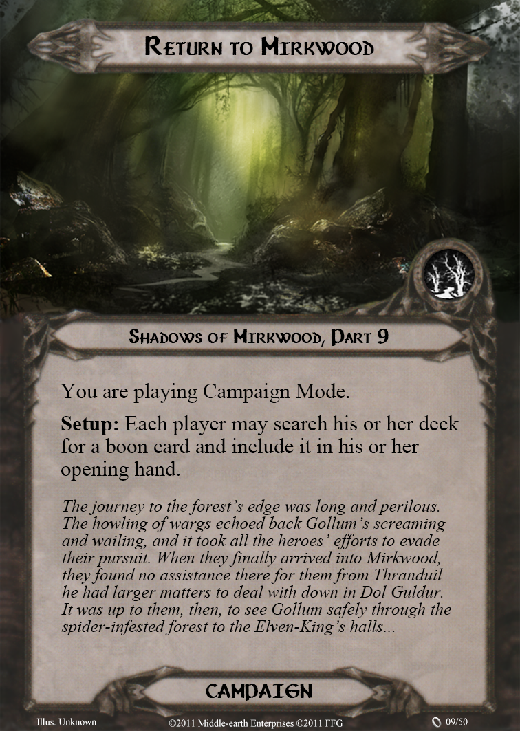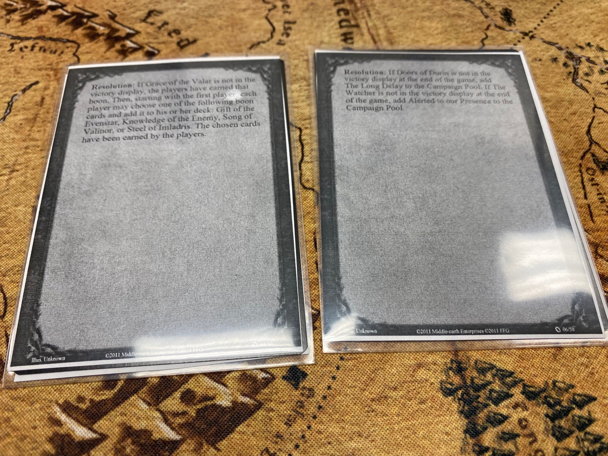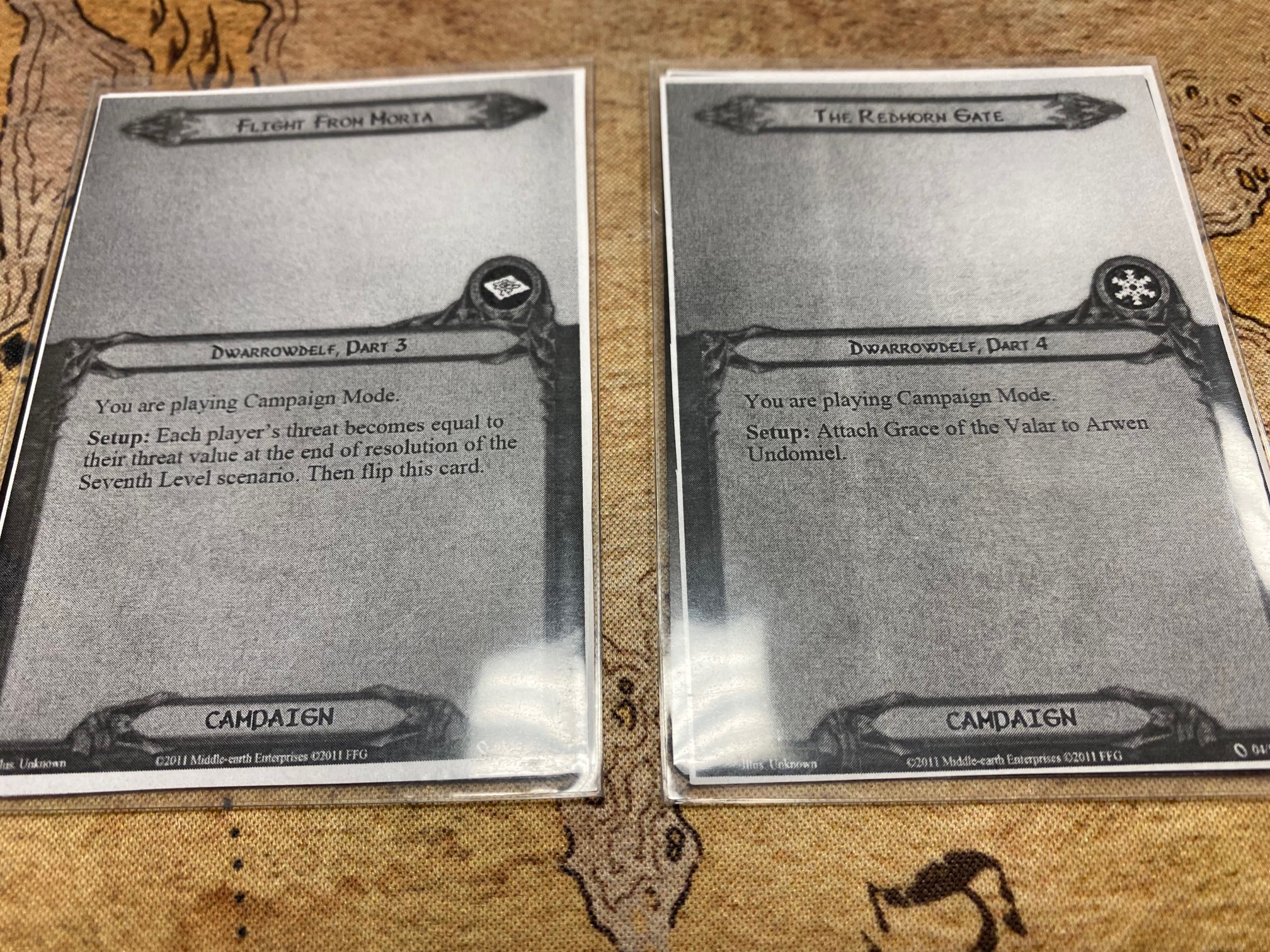 These two custom campaigns allowed players to rediscover those cycles with campaign cards that provided unique and flavorful rules for each scenario; and added boons and burdens into the mix, a concept that was still very fresh for The Lord of the Rings LCG game system. Given that the chances of revised reprints (and thus, a campaign element) for these two cycles is very slim, this is one of the only ways to enjoy them as an interconnected experience, straight from the mind of a future FFG developer.