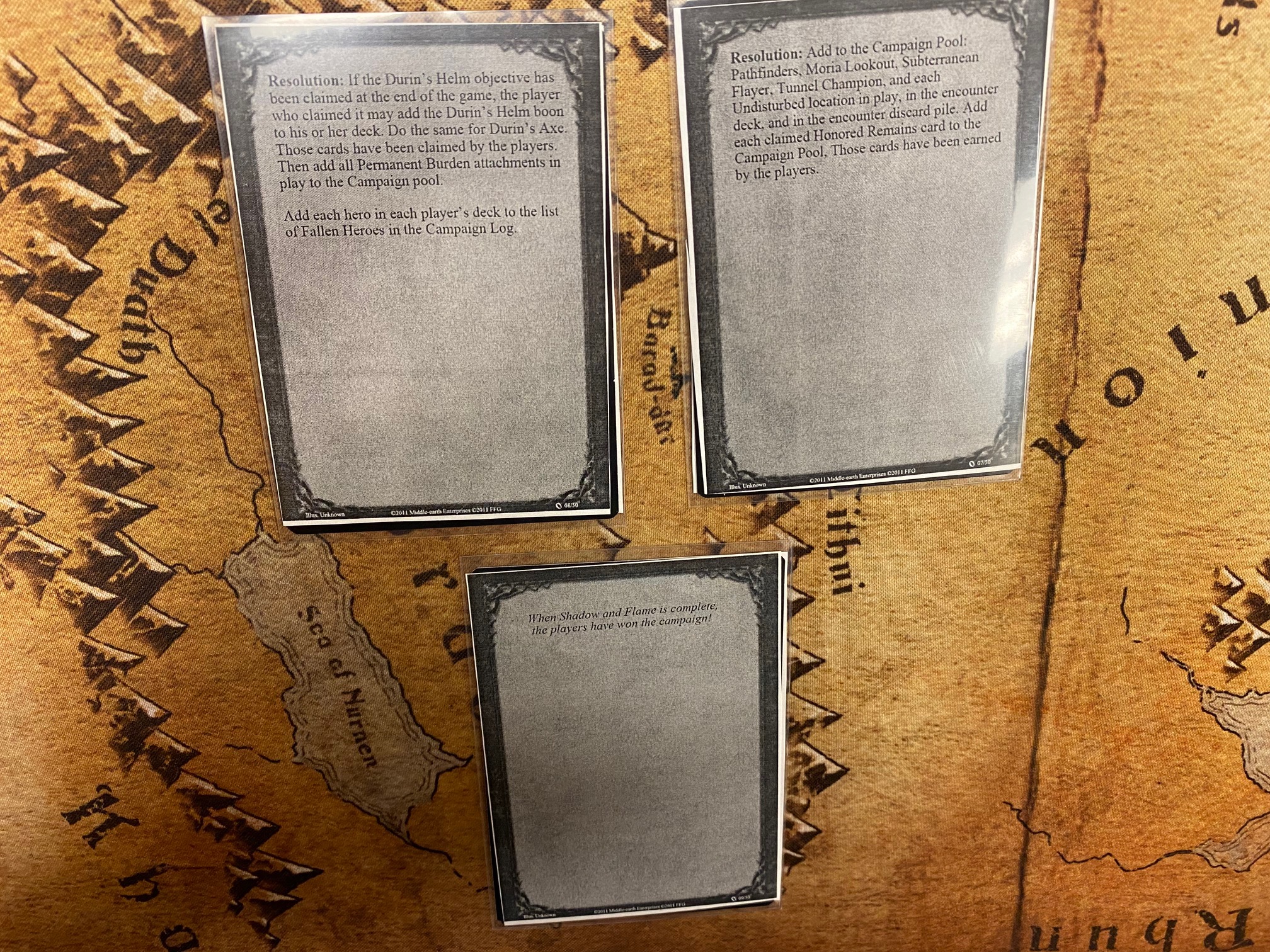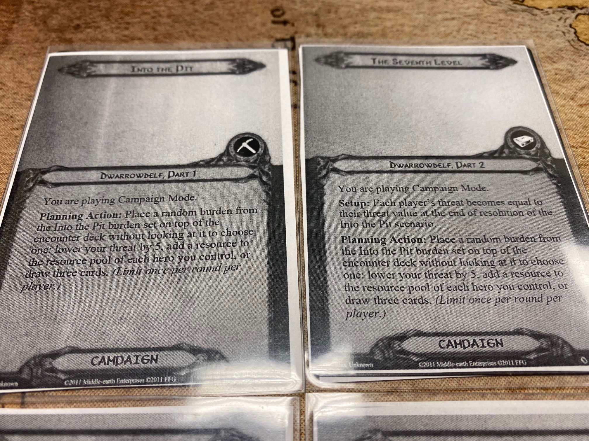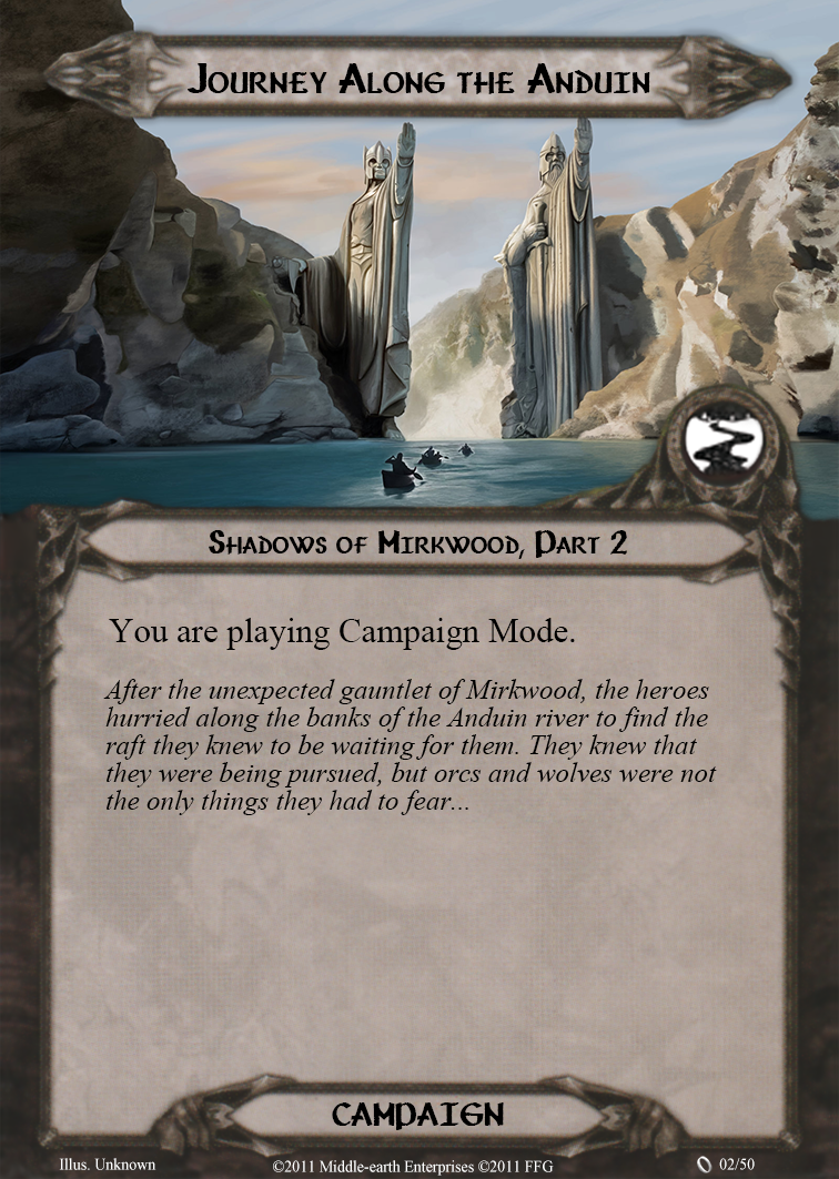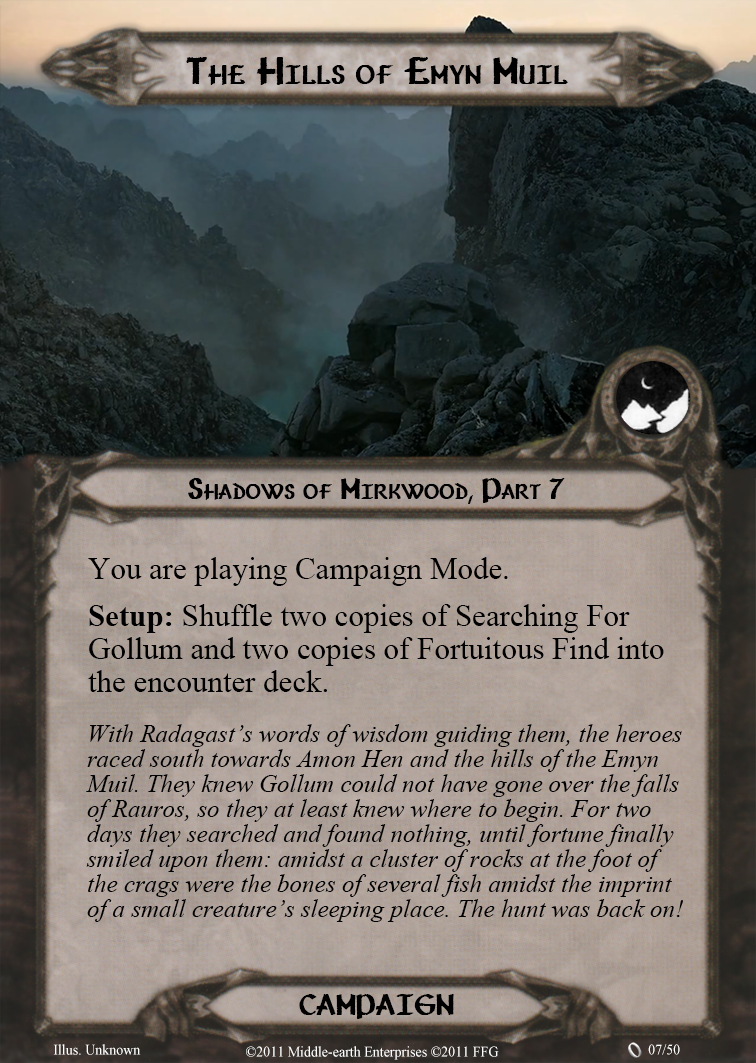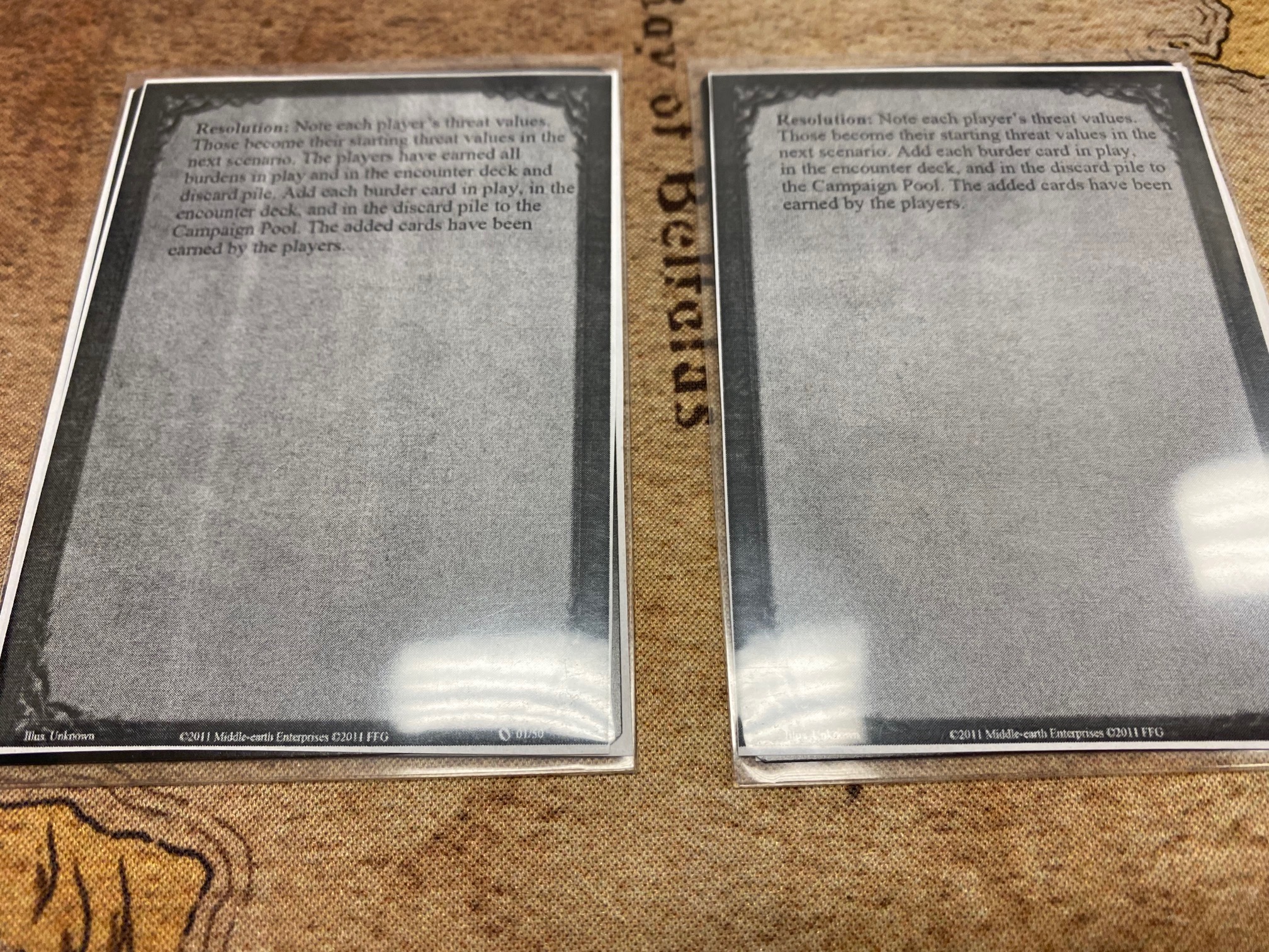 These two custom campaigns allowed players to rediscover those cycles with campaign cards that provided unique and flavorful rules for each scenario; and added boons and burdens into the mix, a concept that was still very fresh for The Lord of the Rings LCG game system. Given that the chances of revised reprints (and thus, a campaign element) for these two cycles is very slim, this is one of the only ways to enjoy them as an interconnected experience, straight from the mind of a future FFG developer.