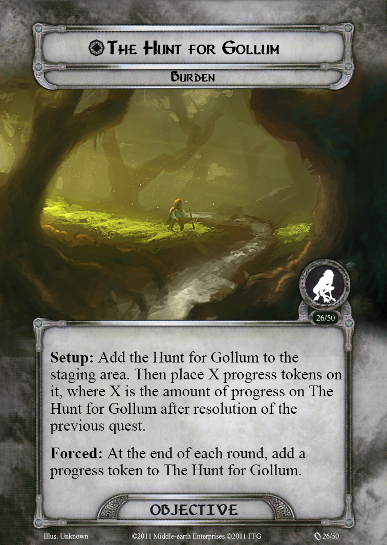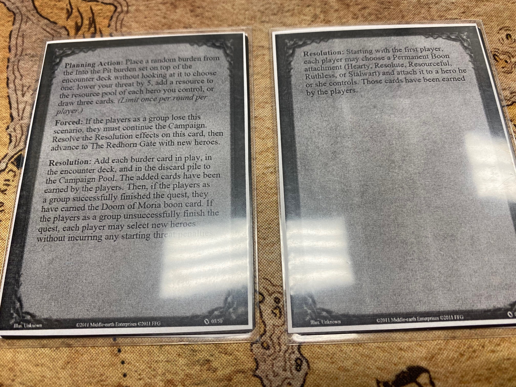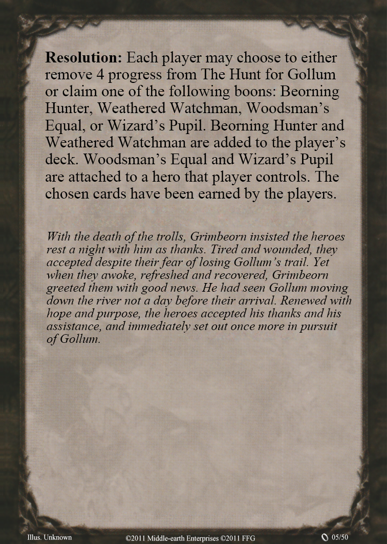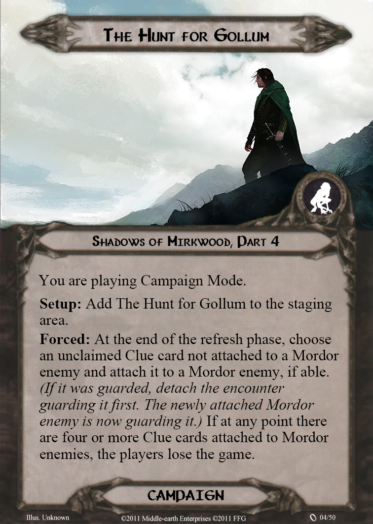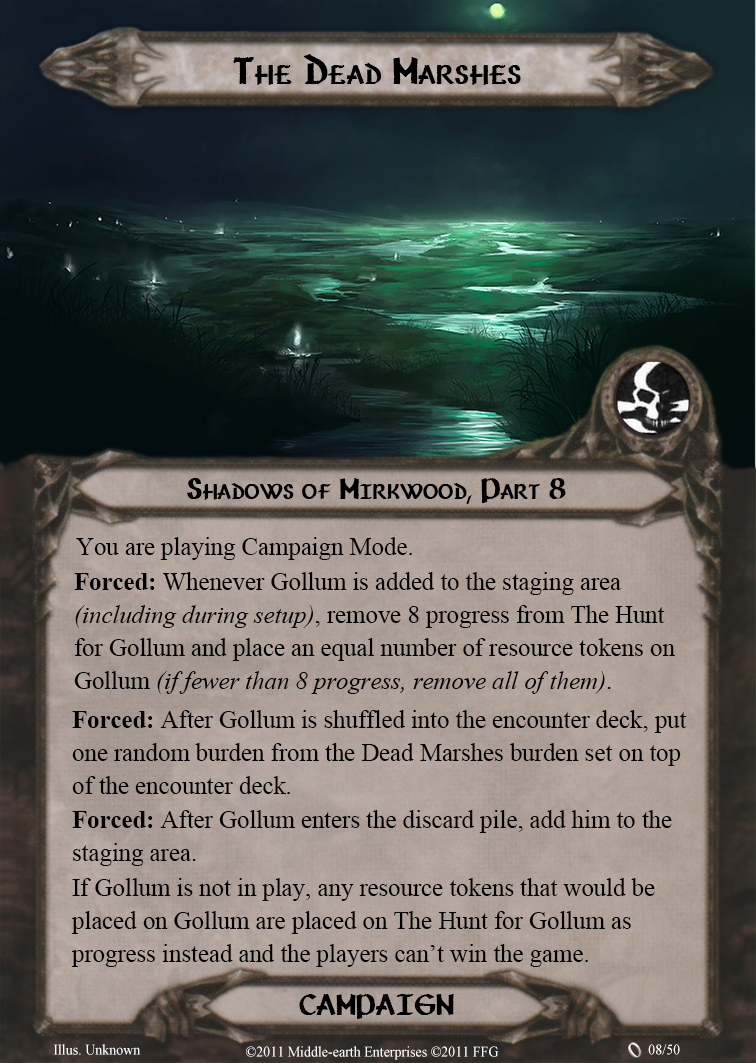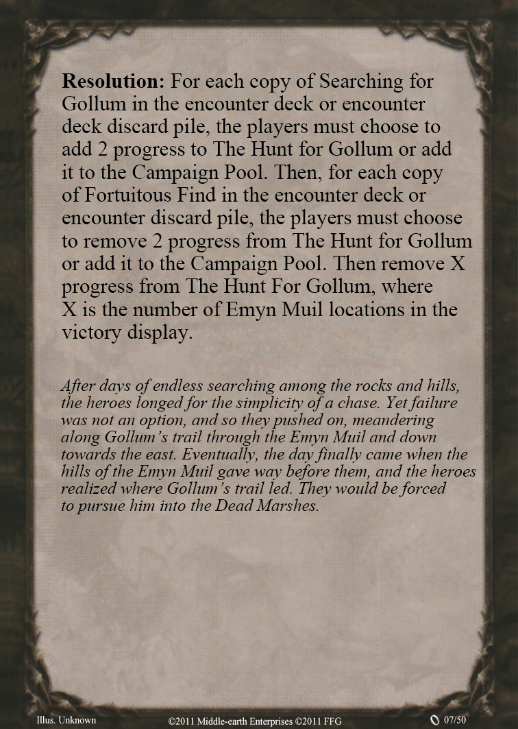 These two custom campaigns allowed players to rediscover those cycles with campaign cards that provided unique and flavorful rules for each scenario; and added boons and burdens into the mix, a concept that was still very fresh for The Lord of the Rings LCG game system. Given that the chances of revised reprints (and thus, a campaign element) for these two cycles is very slim, this is one of the only ways to enjoy them as an interconnected experience, straight from the mind of a future FFG developer.