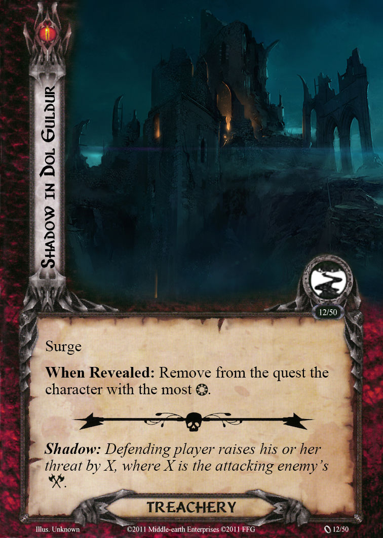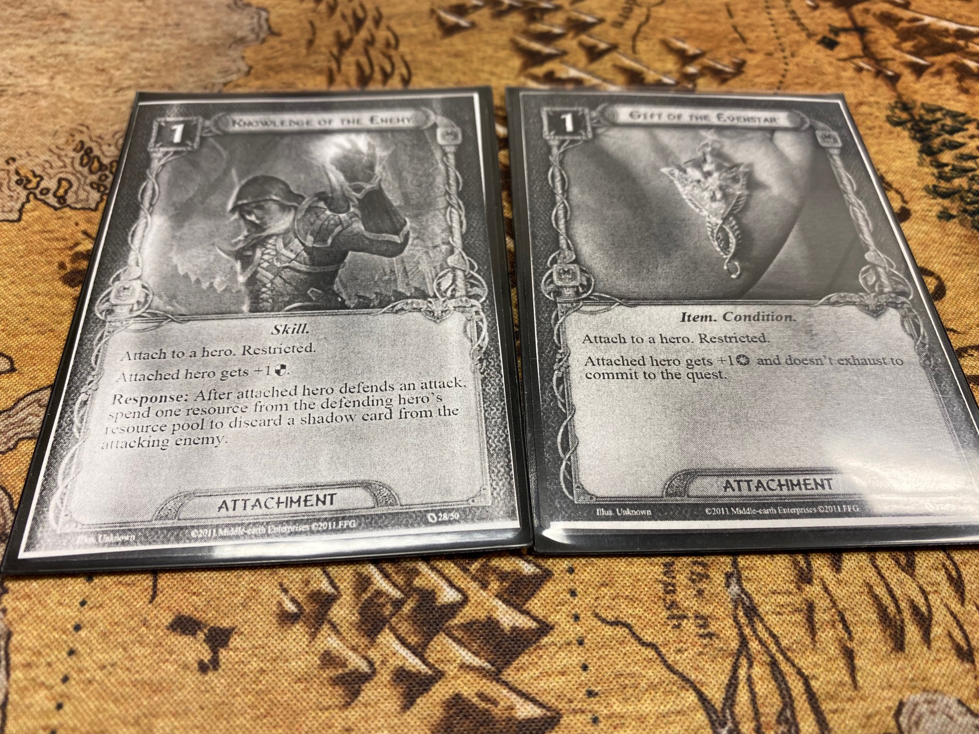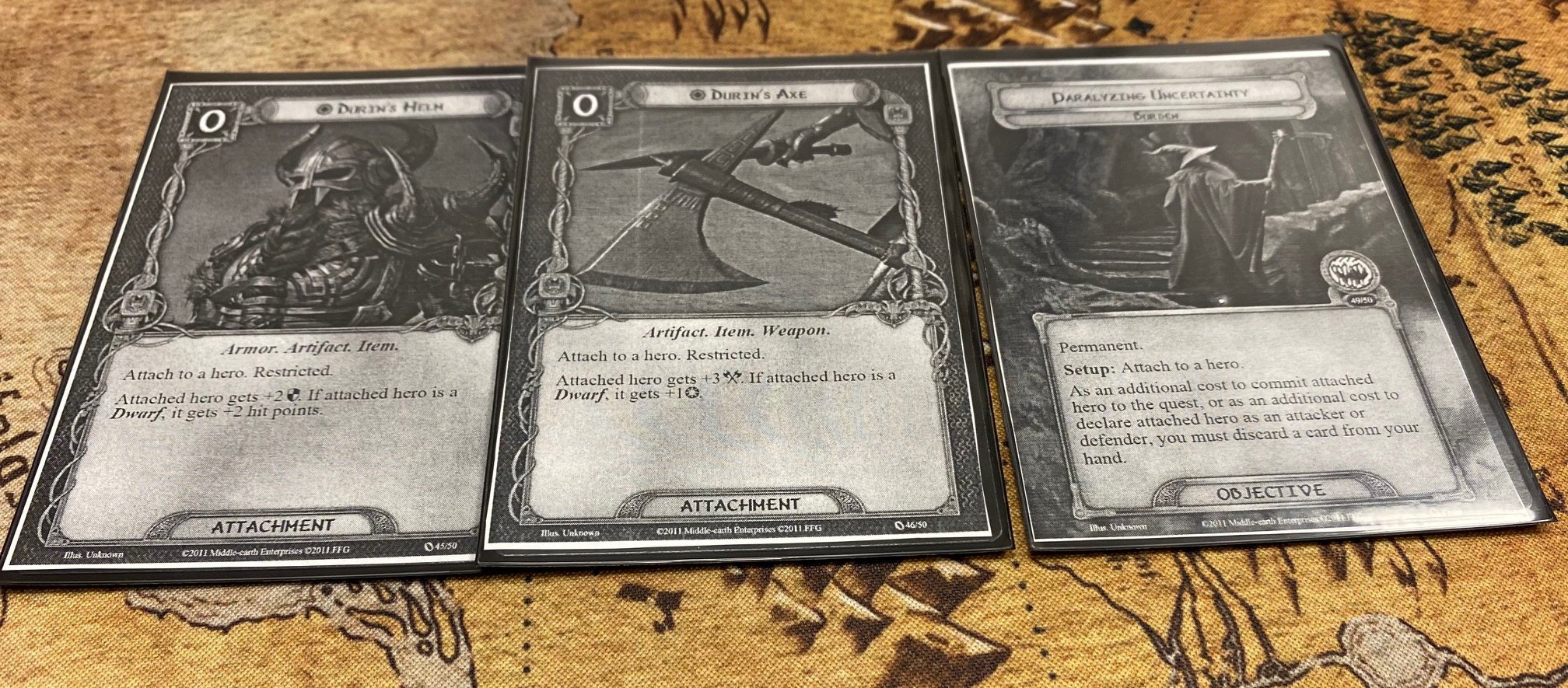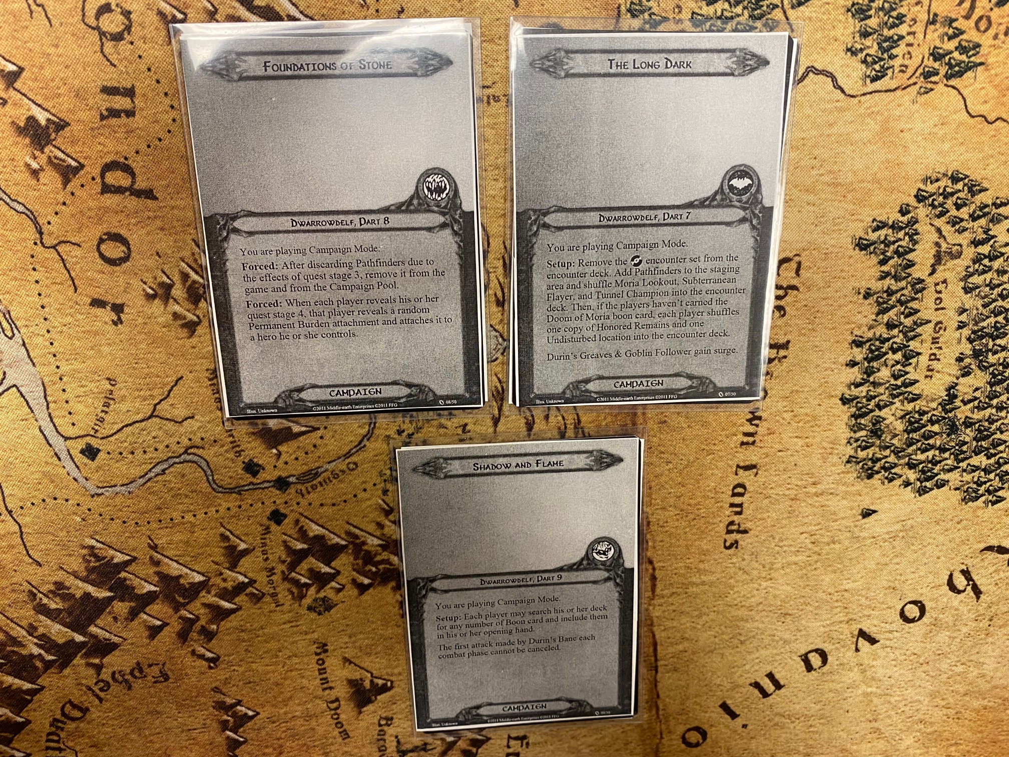 Sadly, these campaigns were lost to the annals of time. There is an archived record of a blog post on Team Covenant on September 15, 2014 for the Shadows of Mirkwood campaign; but most of the Mirkwood cards and the entire Dwarrowdelf project are nothing but broken images. The only way we have been able to bring this project back into the limelight is via the community: the raw files for Mirkwood, and black and white printed images for Dwarrowdelf.